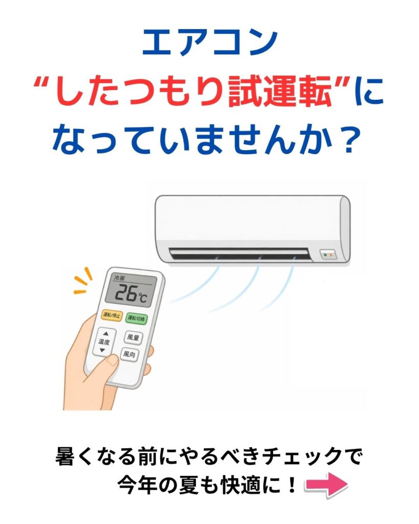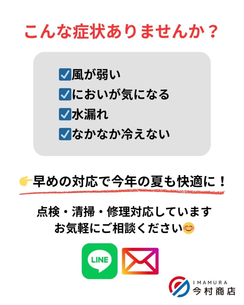 「エアコン試運転したつもり」になっていませんか? 2026.04.23 お知らせ エアコン試運転、出来ていますか? 夏前に確認しておくことでトラブルを未然に防げます。 こんなチェックが大切です!👇 LINEで相談する 電話で相談する GW営業のお知らせ 前の記事